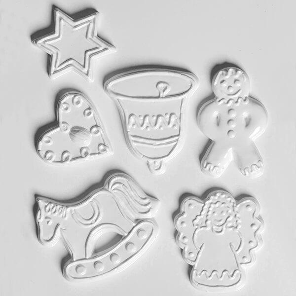 Karácsonyi mézeskalács figurák műanyag öntőforma - 6 különböző motívum A Hobbyművész műanyag öntőformákba önthető, nyomható anyagok:  modellgipsz ,   kerámiapor ,   hobbibeton ,   ékszerbeton ,   FIMO gyurmák ,   szappan . 6 motívum