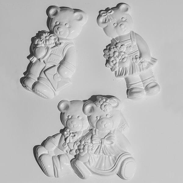Ünneplő macik műanyag öntőforma - 3 különböző motívum A Hobbyművész műanyag öntőformákba önthető, nyomható anyagok:  modellgipsz ,   kerámiapor ,   hobbibeton ,   ékszerbeton ,   FIMO gyurmák ,   szappan . 3 motívum